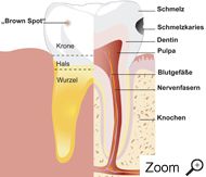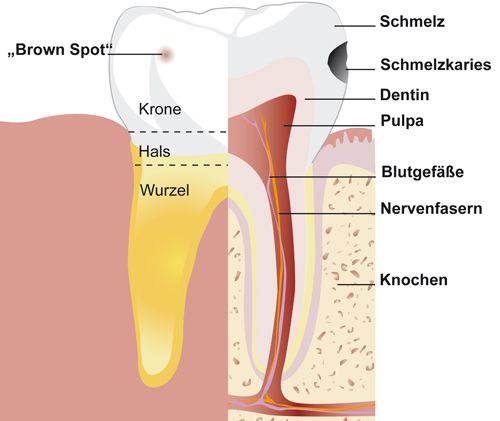 Karies zerstört die harte Zahnsubstanz. Dazu gehören der Zahnschmelz (die Ummantelung der Zahnkrone), das Zahnbein (auch „Dentin“), das die Hauptmasse des Zahnes darstellt und der Zahnzement, der die Zahnwurzel überzieht.